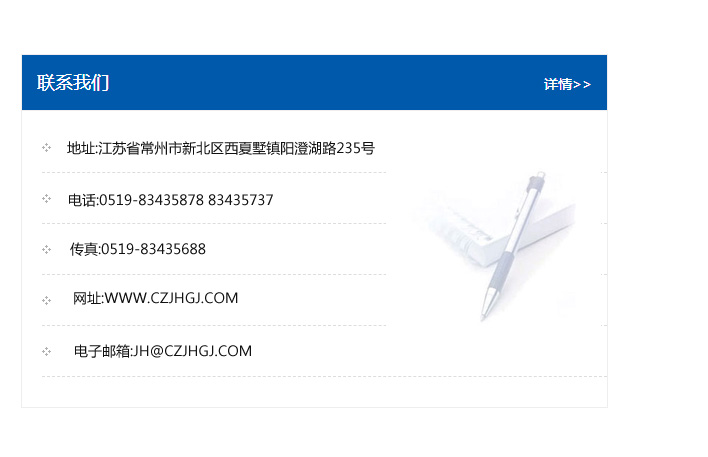 傳真:0519-83435688    郵編:213135    網址:WWW.czjhgj_com.liang1314.com    電子郵箱:JH@czjhgj_com.liang1314.com
